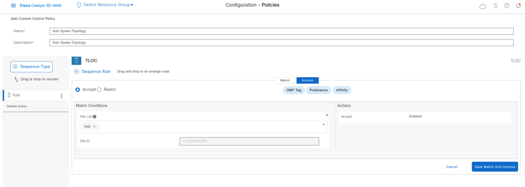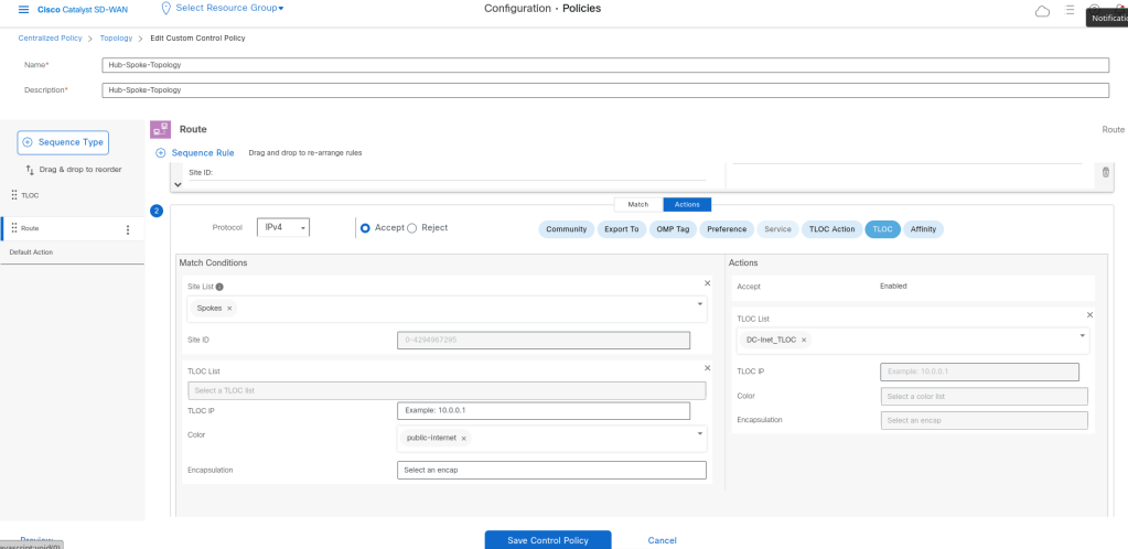 The condition should be like that: If the route is a spoke route and the coler is Internet the tloc for that route should be changed to DC-Inet-Tloc, and if the route is from Spoke but with MPLS color it should be changed to DC-MPLS-Tloc. We should do that because we have 2 colors which they don’t have connectivity with each other.