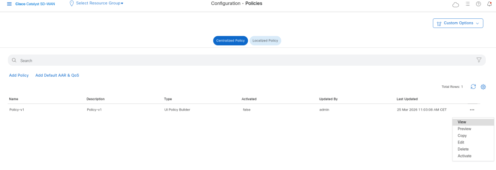 I go to the Policy Tab in vmanage and add a new central policy.