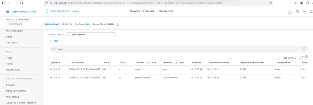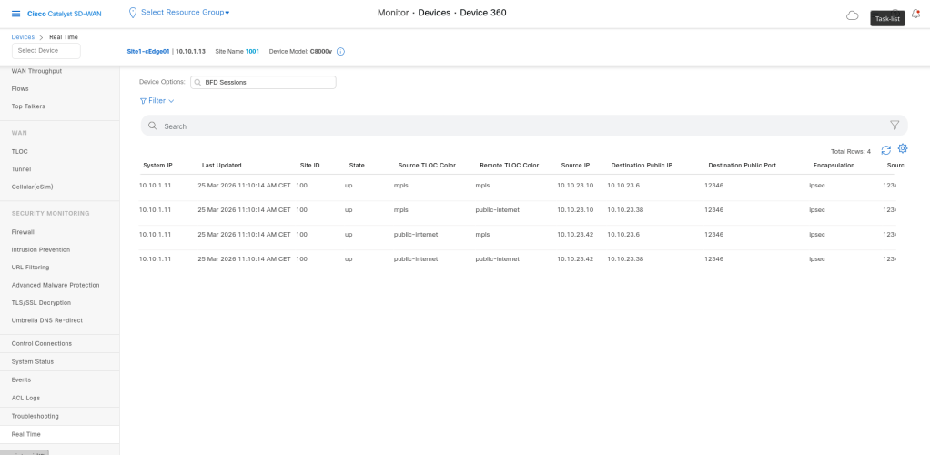 At first lets look ad the current BFD sessions on a cEdge: