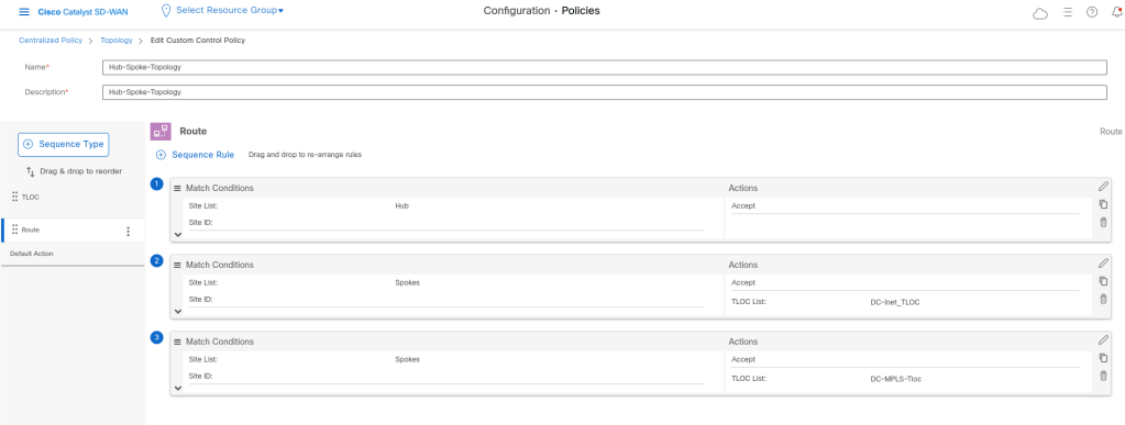 In route polcy I want to allow the routes of DC at first, and then change the Tloc of the Branch routes to DC-Tloc.