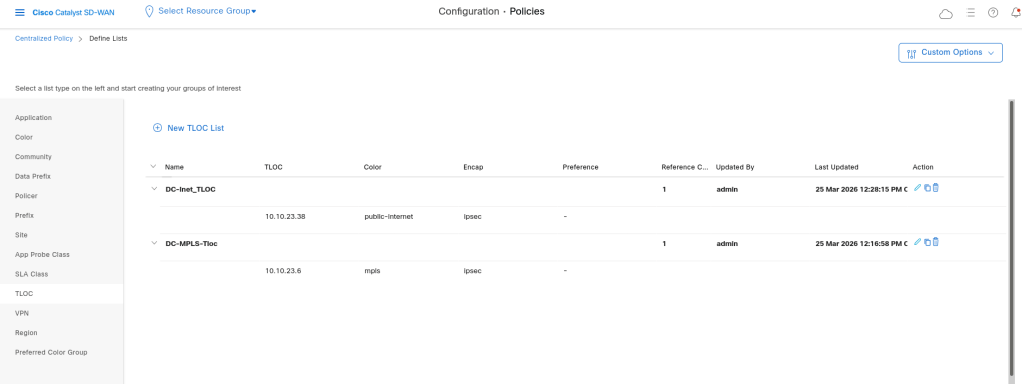 I also add two DC-Tlocs for Internet and MPLS which i want to use them in my topology policy: