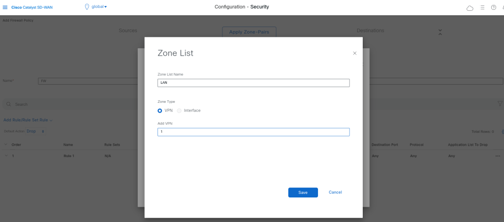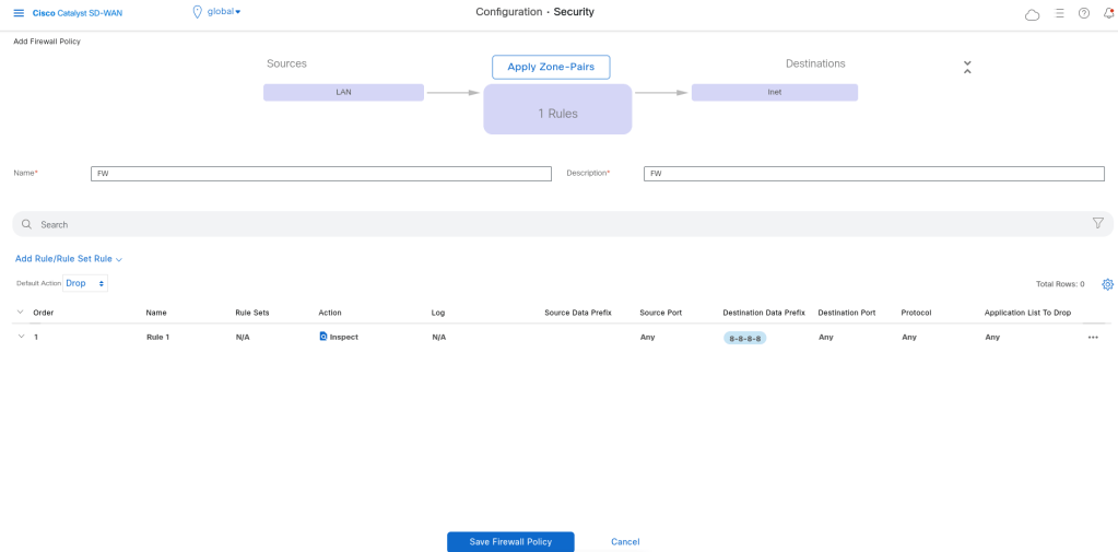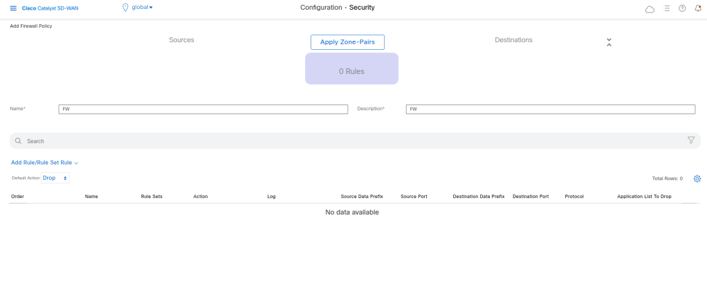 For adding Firewall Policies, we need to define zones and the write rules which will be apply between zones: