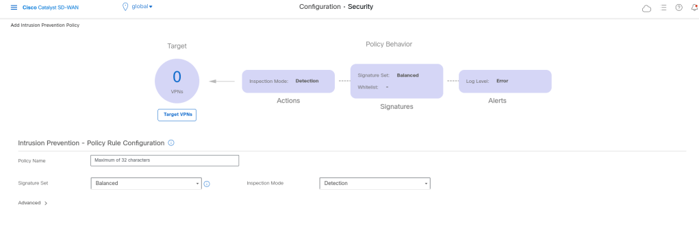 After saving the security policy we can call it in device template, so that will be pushed with netconf to the device. If we use IPS/IDS the device will also download the security container image.
