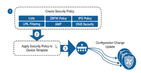 Cisco SD-WAN security policies are built as a layered model, where multiple security functions are applied sequentially to traffic. This allows organizations to combine access control, threat detection, and content filtering into a single unified policy.