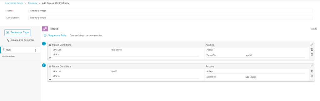 - the shared services VPN imports the consumer routes only if services need to initiate or reply to them
