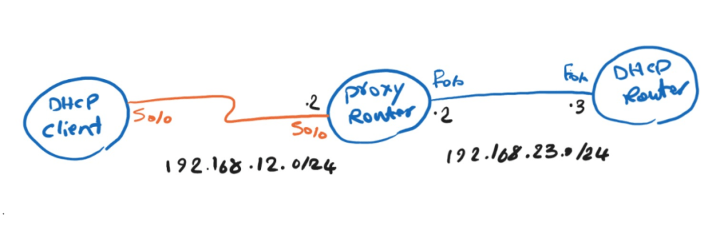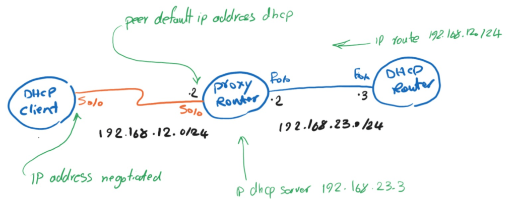 On proxy-router we have “ip dhcp-server 192.168.23.3” command, This tells it where the DHCP server is.