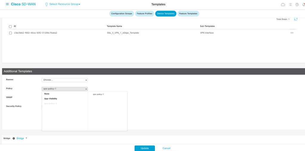 We should add the Policy to the edge device Template, after that we can use it on the interface: