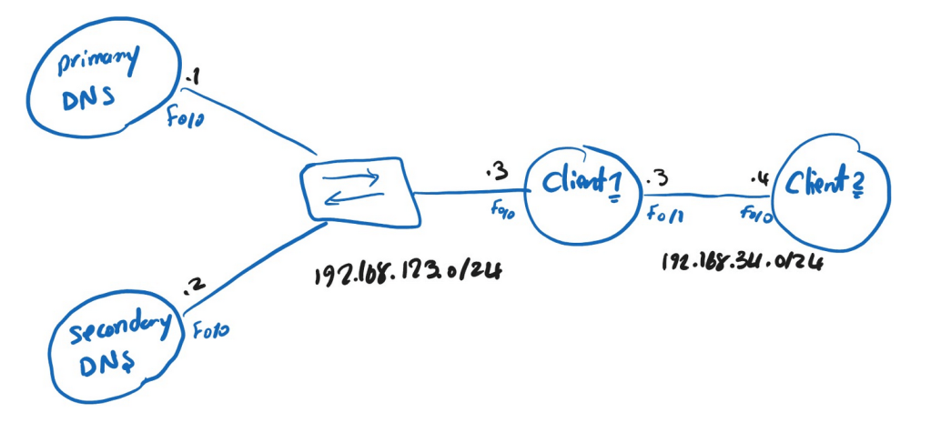 The lab contains two DNS servers and two clients. One of the clients also works as a local DNS server for another client.