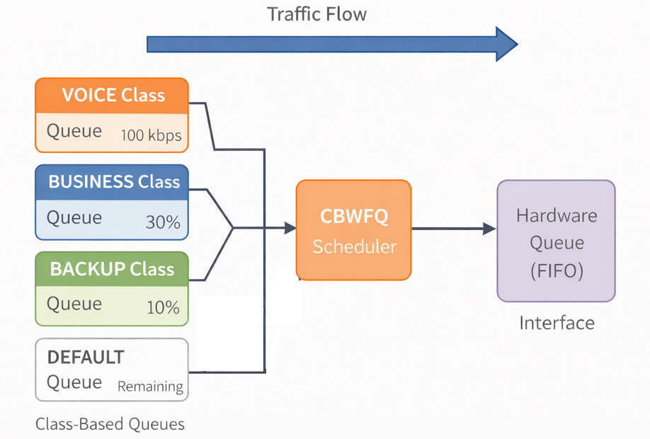 With CBWFQ, we can define exactly how much bandwidth each type of traffic should receive. For example, we can guarantee a portion of the link for business applications and limit how much backup traffic can consume.