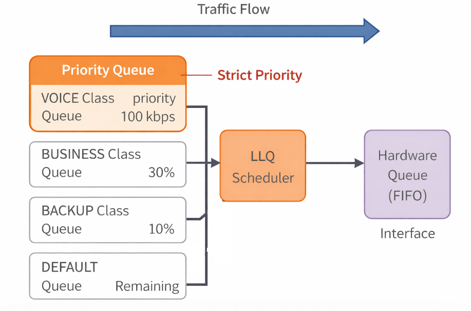 This makes LLQ ideal for voice traffic, where delay and jitter must be minimized.