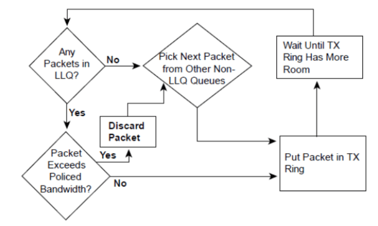 With LLQ, voice traffic is placed into a priority queue and is transmitted immediately, regardless of other queues.